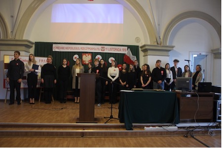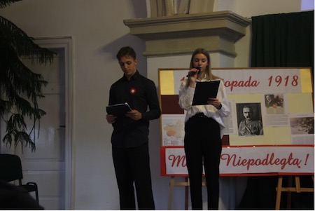 Akademię rozpoczął utwór: „Uwierz Polsko” w wykonaniu Oliwii Bieleckiej z klasy 3d. Następnie o trudnych czasach, kiedy Polska jako kraj nie istniała na mapie Europy przypomnieli Julia Niańko i Kacper Wodyk z klasy 3e, prowadzący część artystyczną.
