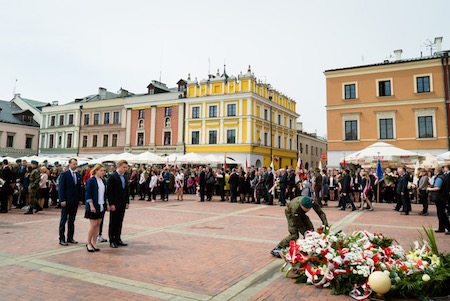 3 maja br. o godzinie 11 na Rynku Wielkim odbyła się manifestacja patriotyczna z ceremoniałem wojskowym. Przemówienie wygłosił prezydent Andrzej Wnuk. Później odczytany został Apel Pamięci i oddana salwa honorowa. Pod koniec uroczystości zostały złożone wiązanki kwiatów przy tablicy upamiętniającej wizytę marszałka Józefa Piłsudskiego w 1922 roku w Zamościu. Przemarsz defilady wojskowej i pocztów sztandarowych zakończył święto.