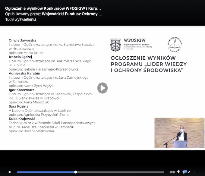 Prace badawcze oraz działania edukacyjne, które w ramach II edycji Programu „Lider wiedzy i ochrony środowiska” przeprowadziła Agnieszka Karabin zyskały wysoką ocenę Wojewódzkiego Funduszu Ochrony Środowiska. Uczennica otrzymała tytuł laureata. Ze względu na obecne ograniczenia, uroczyste ogłoszenie wyników odbyło się za pośrednictwem konta Facebook WFOŚiGW w Lublinie 24 listopada od godz.14.00.