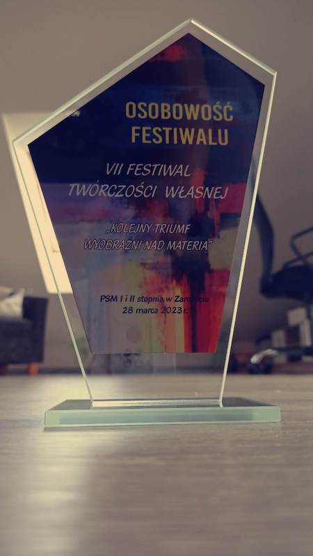 - Nagroda "Osobowość festiwalu" na VII Festiwalu Twórczości własnej organizowanym przez PSM I i II stopnia w Zamościu