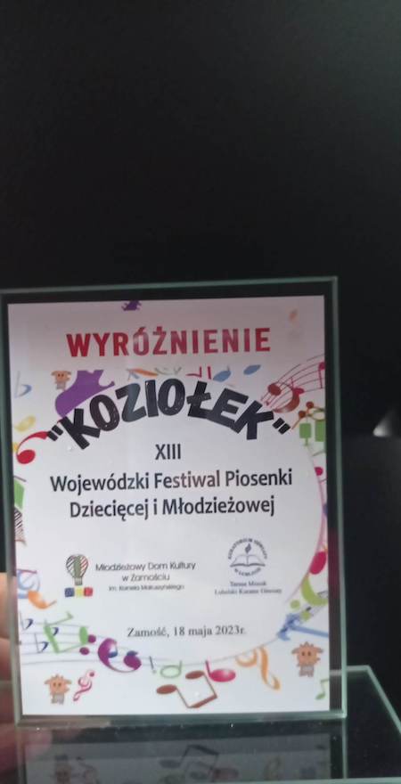 - Wyróżnienie na XIII Wojewódzkim Festiwalu Piosenki Dziecięcej i Młodzieżowej "Koziołek" 2023