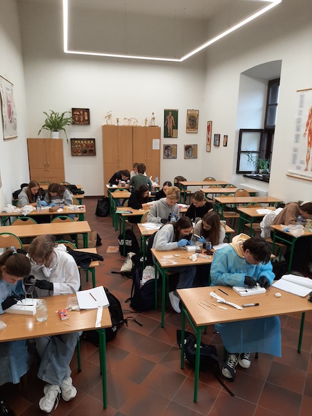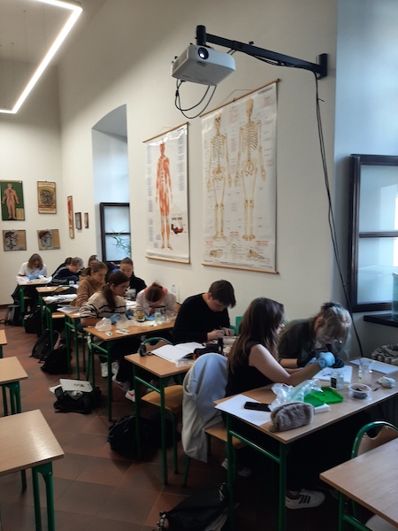 W 2 osobowych zespołach wykonywali sekcję skąposzczetów, zapoznając się z metodologią badań anatomicznych (porządek na stole sekcyjnym hierarchia instrumentów sekcyjnych).