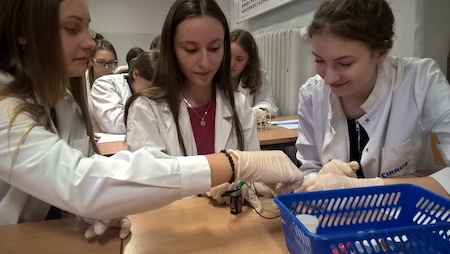Uczniowie samodzielnie wykonywali szereg inspirujących doświadczeń m.in.: porównywali moc kwasów, przeprowadzili elektrolizę wody i otrzymywali acetylen. Mamy nadzieję, że przyjazna atmosfera podczas zajęć rozbudziła zainteresowania chemiczne uczniów.