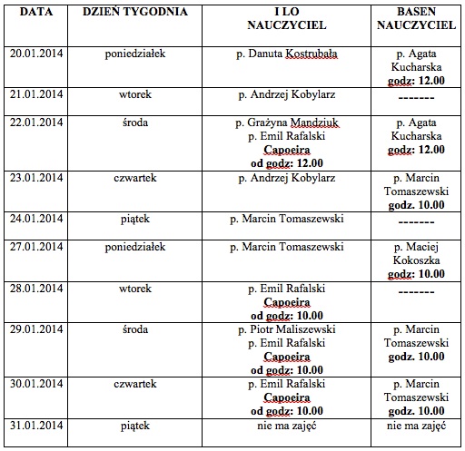 Zajęcia na krytej pływalni (godziny wejść w harmonogramie), zapraszamy także na zajęcia z Capoeiry.