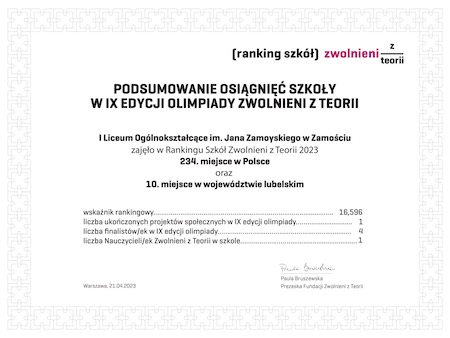 Miło nam poinformować, że nasze liceum znalazło się w Rankingu Szkół Zwolnionych z Teorii. Ranking to forma wyróżnienia dla szkół, które zachęcają uczniów i uczennice do realizacji projektów społecznych, kształcącą świadomych, gotowych do podjęcia wyzwań młodych ludzi.