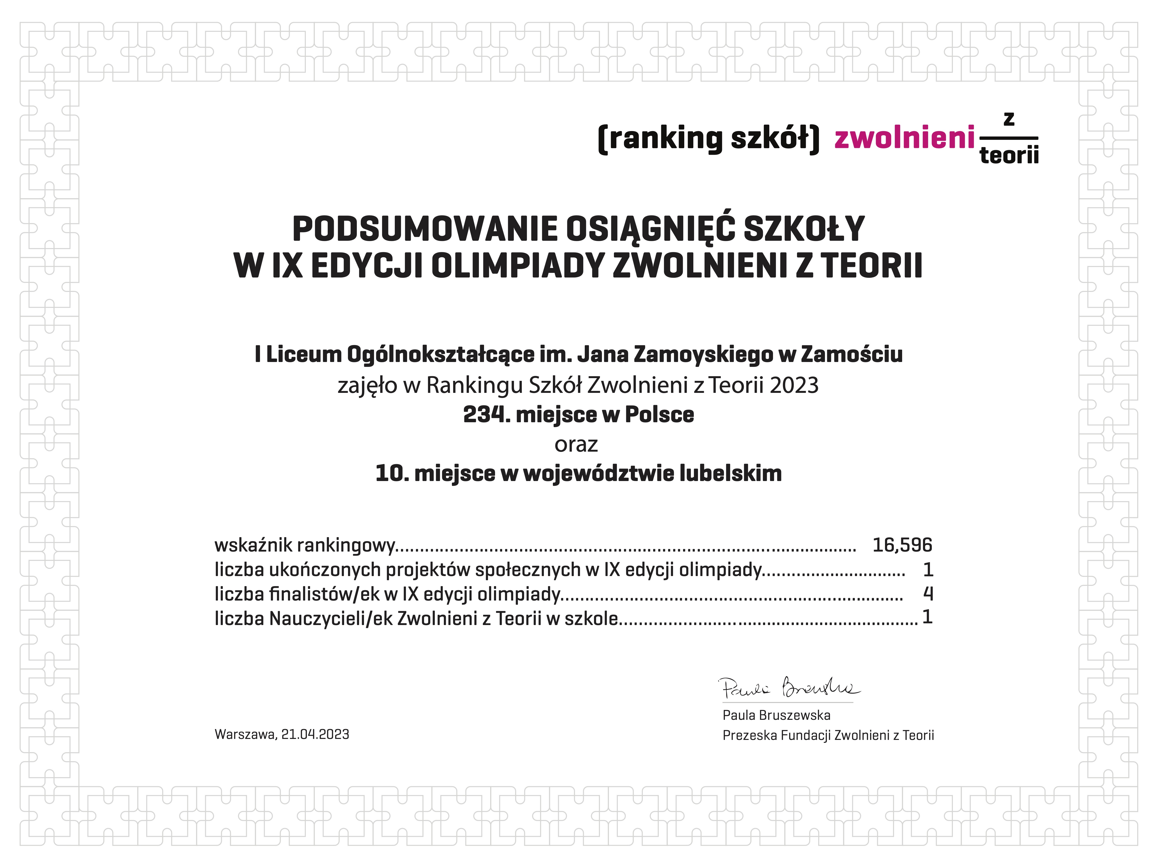 I LO w Rankingu Szkół Zwolnionych z Teorii
