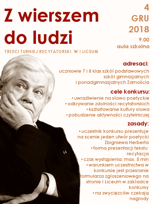 Zapraszamy młodych ludzi obdarzonych talentem recytatorskim do podróży w świat poezji Pana Cogito. Możecie zaprezentować swoje umiejętności oraz zmierzyć się z innymi uczestnikami naszego konkursu. Na zwycięzców czekają nagrody! Szczegóły w zakładce Konkursy.