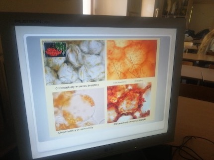Uczniowie dokonali obserwacji chromoplastów w komórkach miękiszu owocu jarzębiny, papryki oraz korzenia marchwi. Wykorzystując korę drzew rosnących przed budynkiem szkoły przygotowali także preparaty mikroskopowe pierwotka w celu obserwacji kształtu i rozmieszczenia chloroplastów w jego komórkach.