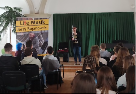 Podzielił się z uczniami wspomnieniami, zagrał kilka zróżnicowanych stylistycznie utworów: od Mozarta po jazz, prezentując wirtuozerię gry na klarnecie, a nawet zdradził tajniki budowy instrumentu. Pan Jerzy jest muzykiem światowej sławy, ale także świetnym popularyzatorem muzyki doskonale nawiązującym kontakt z publicznością. Zachęcał młodzież do realizacji swoich pasji i doskonalenia talentów. Ci, którzy nie mogli być na spotkaniu mogą zajrzeć na:
