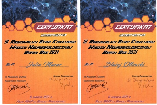 Julia Mazur i Błażej Otłowski z klasy 3i uzyskali certyfikaty uczestnictwa w etapie okręgowym The Polish Brain Bee Championship-Konkursu neurobiologicznego dla uczniów szkół średnich. Międzynarodowy Konkurs Wiedzy Neurobiologicznej Brain Bee odbywa się pod patronatem Polskiego Towarzystwa Przyrodników im. Kopernika.