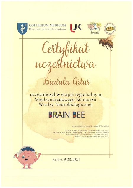 09 marca 2024 r. Artur Biedula uczeń klasy 1h uczestniczył w etapie okręgowym Międzynarodowego Konkursu Neurobiologicznego The Polish Brain Bee Championship. Celem Konkursu jest propagowanie wiedzy neurobiologicznej.
