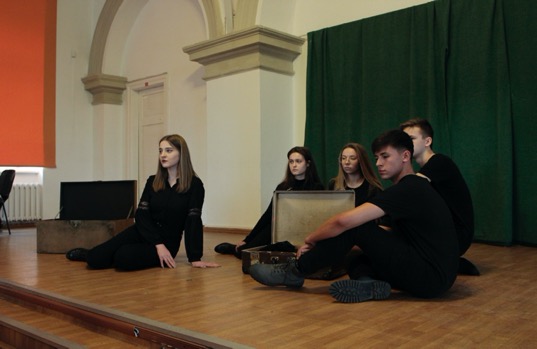 W oczekiwaniu na werdykt jury konkursowego uczniowie obejrzeli spektakl pod tytułem „Przedmioty”, który przygotowali uczniowie pracujący w Kole Żywego Słowa pod kierunkiem pana profesora Piotra Linka we współpracy z grupą teatralną Młodzieżowego Domu Kultury prowadzoną przez pana Piotra Johaniuka.