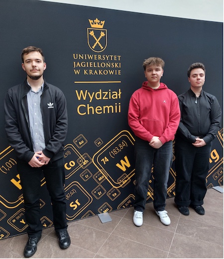 Uczniowie naszej szkoły zainteresowani chemią, a w przyszłości kierunkami chemicznymi, chętnie uczestniczą w konkursach organizowanych przez renomowane uczelnie. Konkursy te są zazwyczaj kilkuetapowe, a nasi uczniowie pokonując kolejne etapy osiągają tytuły laureatów lub finalistów, ucząc się przy okazji systematyczności i cierpliwości w oczekiwaniu na wyniki. W marcu b.r. udział w III finałowym etapie Olimpiady Wiedzy Chemicznej z Uniwersytetem Jagiellońskim wzięli: Jakub Pacaj z klasy 4G, Emil Pawelczyk z klasy 3H oraz Jakub Bednarczyk, który osiągnął znakomity wynik, będąc uczniem klasy 2G. Ponadto Jakub Pacaj, 23 marca weźmie udział w III finalnym etapie Olimpiady o Diamentowy indeks AGH w Krakowie.
