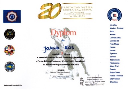 Jakub Kot /2c/ świetnie zaprezentował się w Zawodach Technik Interwencji i Samoobrony, które odbyły się w Kaliszu. Zajął 3 miejsce w rywalizacji o Puchar Rektora tej uczelni.
