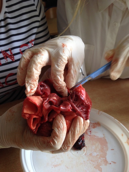 Wszyscy uczniowie mieli wyjątkową okazję by połączyć wiedzę teoretyczną o budowie anatomicznej serca człowieka z praktyką w postaci dokonania sekcji serca wieprzowego. Młodzież naszej szkoły z precyzją przyszłych chirurgów ;) doskonale posługiwała się skalpelami, dokonując wnikliwych obserwacji szczegółów anatomicznych: m. in głównych naczyń krwionośnych serca- „korony serca”, zastawek, przedsionków, komór, naczyń wieńcowych.