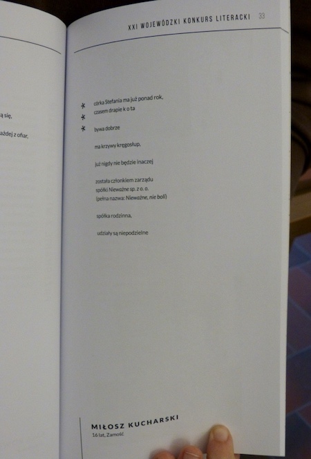 3 grudnia na uroczystej gali w Centrum Spotkania Kultur w Lublinie po raz 21. rozstrzygnięto Wojewódzki Konkurs Literacki. Miło nam donieść, że w gronie laureatów znalazł się jedyny przedstawiciel zamojskich szkół, szlifujący swój talent na zajęciach Klubu Żywego Słowa, uczeń naszego Liceum, Miłosz Kucharski. Oprócz nagrody pieniężnej laureat może pochwalić się publikacją w wydawnictwie pokonkursowym „Podróż”.