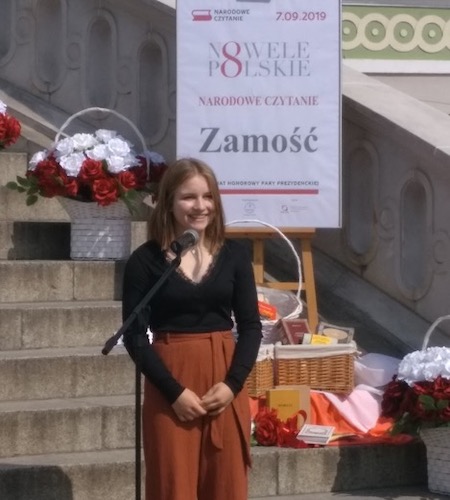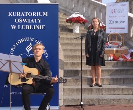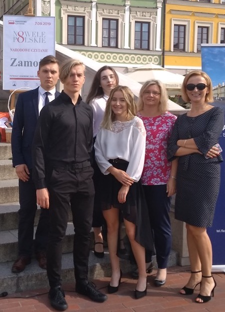 We wspólne czytanie polskich nowel pod schodami zamojskiego ratusza włączyli się uczniowie i poloniści naszego liceum. Uczniowie przygotowali oprawę muzyczną uroczystości. Paulina Czugała, Weronika Bielińska, Mikołaj Chmura z klasy 3e, Agata Ostasz z 2h i Jakub Kot z 3c wykonali pełne zadumy piosenki poetyckie. Dominika Książka z klasy 2i oraz Daria Pitak z klasy 2h recytowały, a fragment noweli Henryka Sienkiewicza „Sachem” przeczytał uczeń klasy 3c Piotr Sikorski. Swoją obecność potwierdziliśmy wpisem do księgi pamiątkowej.