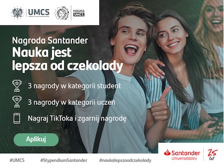 Uniwersytet Marii Curie-Skłodowskiej oraz Santander Bank zapraszają do udziału w konkursie polegającym na nagraniu 60 sekundowego filmiku promującego naukę i naukowców w sposób atrakcyjny dla młodych ludzi. Do wygrania nawet 3 tysiące złotych.