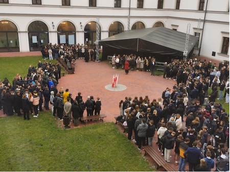 Następnie o symbolicznej godzinie 11.11 na dziedzińcu naszej szkoły wszystkie klasy wspólnie z nauczycielami i chórem pod kierunkiem p. Karoliny Sokół odśpiewały 4 zwrotki „Mazurka Dąbrowskiego” w ramach akcji „Szkoła do hymnu”.