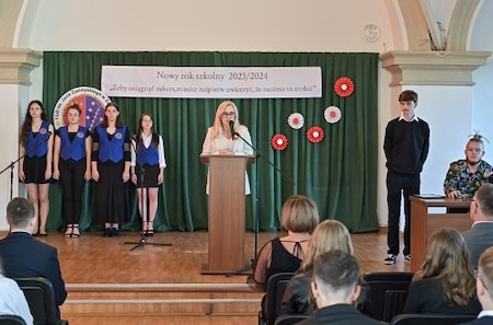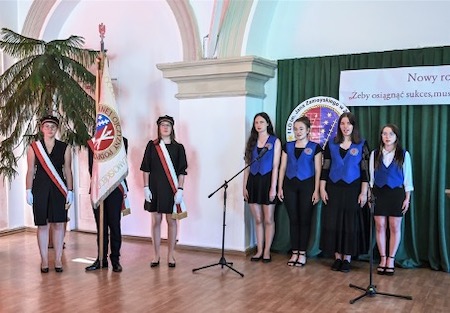 Inauguracja bieżącego roku szkolnego 2023/2024 rozpoczęła się w Sali Kolumnowej I Liceum Ogólnokształcącego uroczystym wprowadzeniem Sztandaru oraz wspólnym odśpiewaniem hymnu państwowego.