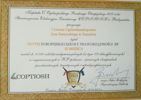 Wśród ok. 6 tys. szkół ponadagiminazjalnych I Liceum Ogólnokształcące zostało wyróżnione tytułem „Złotej Europejskiej Szkoly Praworządności RP” uzyskujac 9 miejsce na 173 sklasyfikowanych szkół. Wyróżnienie to zostało przyznane za osiągnięcia odniesione w roku szkolnym 2015/2016. Na sukces Szkoły złożyły się osiągnięcia uczniów pracujących pod opieką p. Zygmunta Kamińskiego. Sukcesy w 2015/2016 r. to Olimpiada Wiedzy o Prawie, Olimpiada Wiedzy o III RP, Olimpiada Wiedzy o Unii Europejskiej, Olimpiada Wiedzy o Prawach Człowieka w Świecie Współczesnym, Olimpiada Wiedzy o Społeczeństwie, Olimpiada Solidarności, Olimpiada Wiedzy o Polsce i Świecie Współczesnym.