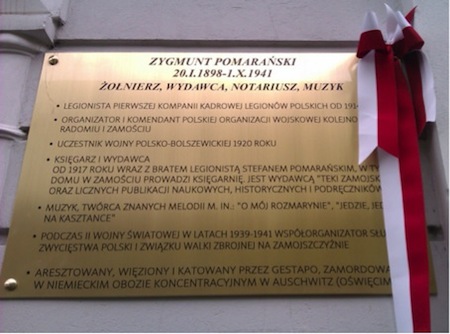 8 maja w Zamościu odbyło się odsłonięcie tablicy upamiętniającej Zygmunta Pomarańskiego – legionisty walczącego m.in. w wojnie polsko-bolszewickiej, ofiary obozu koncentracyjnego w Auschwitz, wydawcy, kompozytora, prawnika, autora melodii do pieśni „O mój rozmarynie”. Odsłonięcia dokonał prezydent miasta Zamość – Marcin Zamoyski.