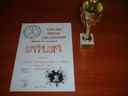 Nasi reprezentanci: Jan Siulkowski, Michał Węgrzyn i Wojciech Zabandżała zdobyli II miejsce w klasyfikacji ogólnej 14 edycji Zamojskiej Ligi Szachowej. W roku szkolnym 2015/2016 odbyło się 8 turniejów szachowych w których uczestniczyli uczniowie zamojskich szkół. Gratulujemy!