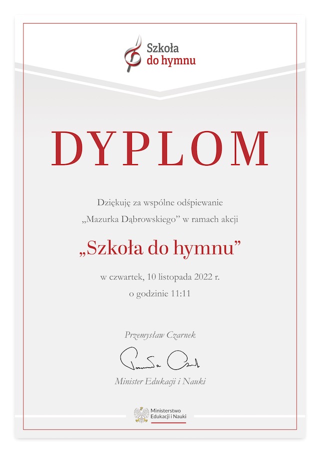 10 listopada o godzinie 11.11 rozpoczęliśmy obchody świętowania 104 rocznicy Odzyskania Niepodległości odśpiewaniem hymnu, włączając się w ogólnopolską akcję #SzkołaDoHymnu. Miło nam poinformować, że otrzymaliśmy pamiątkowy dyplom i podziękowanie Od Ministerstwa Edukacji i Nauki za udział w tym przedsięwzięciu.