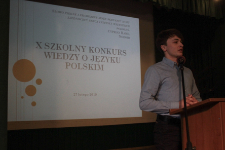 Język polski nie ma tajemnic przed uczestnikami drugiego etapu X Szkolnego Konkursu Wiedzy o Języku Polskim. 27 lutego w auli ośmioro uczniów naszej szkoły, którzy otrzymali największą ilość punktów w części pisemnej, zaprezentowało się podczas ustnej części Konkursu. Mieli za zadanie omówić wybrany problem dotyczący poprawności językowej. Trzeba przyznać, że słuchacze dostali solidną porcję wiedzy zarówno o najczęściej popełnianych błędach językowych, jak i o kulturze języka i jej znaczeniu na co dzień.