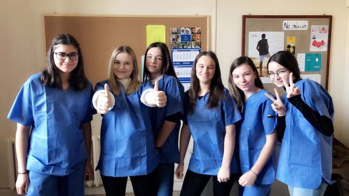 1. Uczniowie przed prelekcją dostają fartuchy dwuczęściowe, które zakładają od razu.