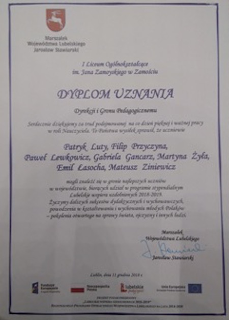 Wśród nagrodzonych znalazła się siódemka naszych uczniów: : Patryk Luty /1a/, Filip Przyczyna /1a/, Paweł Lewkowicz /3a/, Gabriela Gancarz /1g/, Martyna Żyła /1d/, Emil Łasocha /1a/ i Mateusz Ziniewicz /1a/.