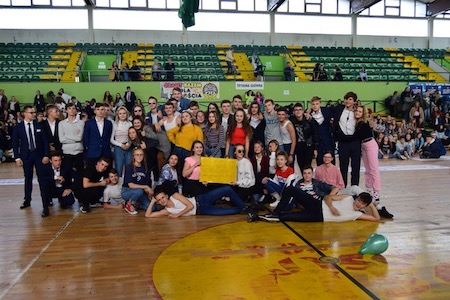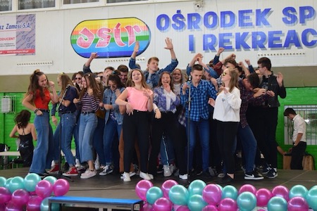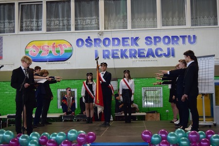 Po oficjalnej części nastąpiły już zupełnie nieoficjalne zmagania konkursowe. Ich pierwszym punktem było odśpiewanie przez poszczególne klasy hymnu z ułożonym przez siebie tekstem i trzeba przyznać, że uczniowie w tej konkurencji wykazali się kreatywnością, entuzjazmem , poczuciem humoru i ogólnie zaprezentowali się świetnie. Następnie zespoły z klas pierwszych wystąpiły w autorskim układzie tanecznym. Ta konkurencja również wywołała żywe poruszenie i została nagrodzona gromkimi brawami. Uczniowie musieli też wziąć udział w teleturnieju „Jaka to melodia?” i odgadnąć tytuły przebojów z lat 80-ych. Jednak najwięcej emocji wywołała zabawa „Top model”, bowiem tutaj liczył się refleks- należało w szybkim tempie zdobyć odpowiednie stroje i ubrać modeli według najnowszych trendów, którzy następnie „na wybiegu” prezentowali efekty pracy „projektantów”. Ostatnim etapem zmagań konkursowych był „Taniec z gwiazdami”, w czasie wykonywania którego uczniowie musieli utrzymać między sobą balon, co oczywiście wymagało nie lada sprytu, pomysłowości i zwinności.