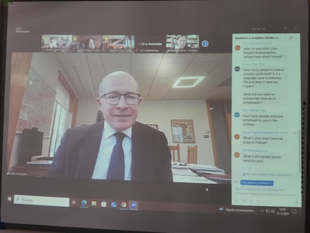 W czwartkowym spotkaniu uczestniczyło 40 szkół zaangażowanych w ten projekt. Pan Ambasador opowiadał o swojej pracy dyplomatycznej oraz o irlandzkich tradycjach związanych ze świętami Bożego Narodzenia. Uczniowie mieli także wyjątkową okazję zadawać pytania w języku angielskim, na które Pan Ambasador odpowiadał z entuzjazmem.