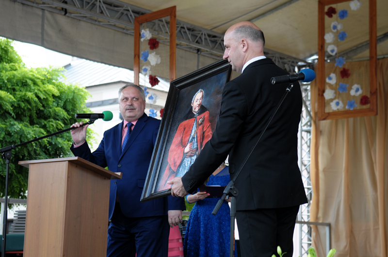 Dalsza część uroczystości odbywała się przed budynkiem Szkoły, pod okiem patrona, który spoglądał na nas z portretu ofiarowanego przez Dyrekcję i Społeczność III LO w Zamościu. Scenografia oddawała atmosferę szkolnych korytarzy. A na twarzach uczestników Jubileuszu widoczna była radość i wzruszenie.