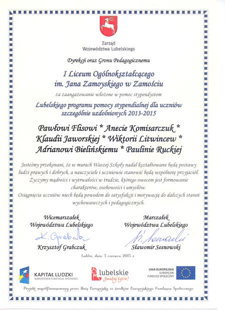 3 czerwca w Centrum Kongresowym Uniwersytetu Przyrodniczego w Lublinie odbyła się konferencja podsumowująca program stypendialny Urzędu Marszałkowskiego Województwa Lubelskiego dla uczniów szczególnie uzdolnionych w latach 2013-2015. Do udziału w niej zaproszeni zostali nasi stypendyści: Aneta Komisarczuk, Klaudia Jaworska, Wiktoria Litwincew, Paulina Rucka, Paweł Flis i Adrian Bieliński. Wicemarszałek Krzysztof Grabczuk pogratulował serdecznie uczniom, rodzicom i nauczycielom, życząc dalszych sukcesów i osiągnięcia upragnionych celów.