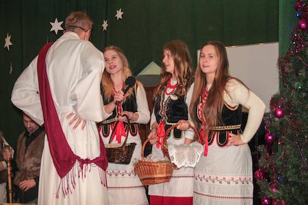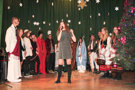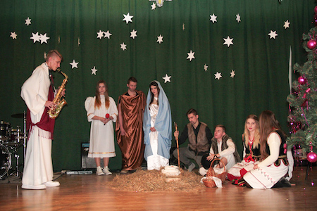 Część artystyczną uroczystości zapoczątkował szkolny chór pod kierownictwem ks. Jerzego Frankiewicza. Wykonał on zarówno piosenki napisane przez księdza, jak i znaną wszystkim kolędę Przybieżeli do Betlejem – trzeba przyznać w dość nietypowej aranżacji. Następnie rozpoczęło się przedstawienie opowiadające o narodzinach Zbawiciela. W postaci wcielili się uczniowie klas pierwszych, którzy pracowali pod kierunkiem pani Bożeny Kukułowicz. Po jasełkach ksiądz Leszek Boryło odczytał fragment Ewangelii opowiadający o przyjściu na świat Jezusa oraz poprowadził wspólną modlitwę. Potem było dzielenie się opłatkiem i życzenia.
