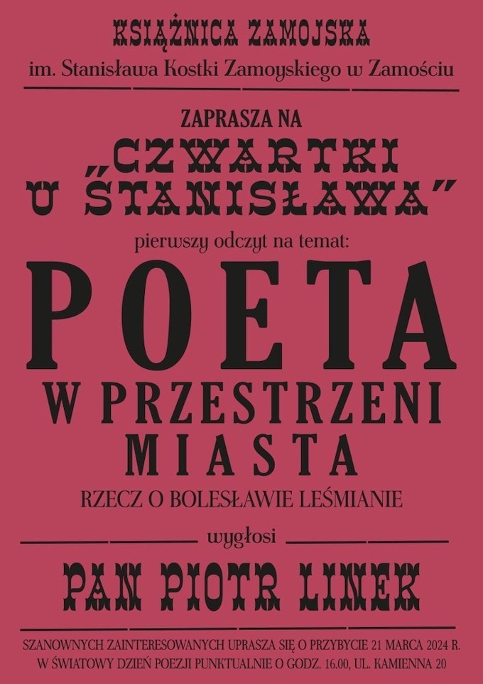 Czytanie poezji to dzisiaj bardzo elitarne hobby, tym niemniej w Światowym Dniu Poezji, czyli 21 marca warto udać się w podróż do krainy wyobraźni. Zwłaszcza, że przewodnikiem po świecie twórczości Leśmiana będzie inny, poniekąd „nasz”, poeta - Piotr Linek. Zapraszamy do Książnicy Zamojskiej.