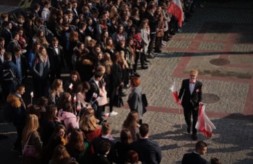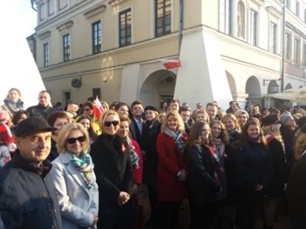 Następnym punktem uroczystych obchodów był happening patriotyczny na Rynku Solnym, w którym wzięli udział wszyscy uczniowie naszej szkoły wraz z nauczycielami, wychowawcami i Dyrekcją. Przedsięwzięcie odbyło się pod hasłem - Śpiewaj z Pierwszym dla Niepodległej. W programie uroczystości znalazło się wspólne odśpiewanie Mazurka Dąbrowskiego o godz.11.11, koncert pieśni patriotycznych w wykonaniu szkolnego chóru, wizualizacja flagi. Happening został poprzedzony imprezami towarzyszącymi, przygotowaniem Kokard Narodowych, rozstrzygnięciem konkursu na plakat Polska Niepodległa. Nad przebiegiem i organizacją tej części uroczystości czuwali p. Agnieszka Niańko i ks. Jerzy Frankiewicz.