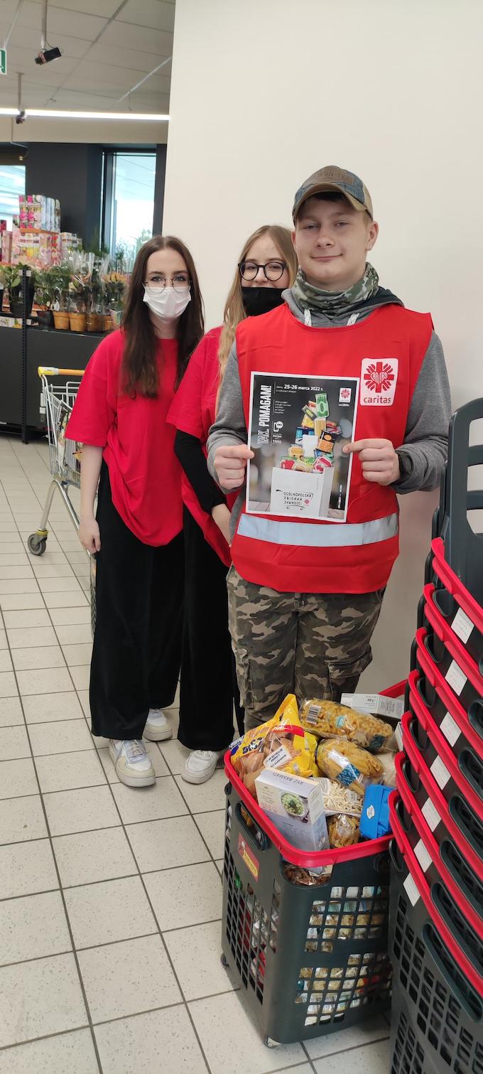 Wolontariusze ze Szkolnego Koła Caritas z I Liceum Ogólnokształcącego w Zamościu włączyli się aktywnie w dwudniową (piątek-sobota) zbiórkę żywności zorganizowaną przez Caritas Diecezji Zamojsko – Lubaczowskiej 25 i 26 marca 2022 r. w sklepie popularnej sieci handlowej w Zamościu.