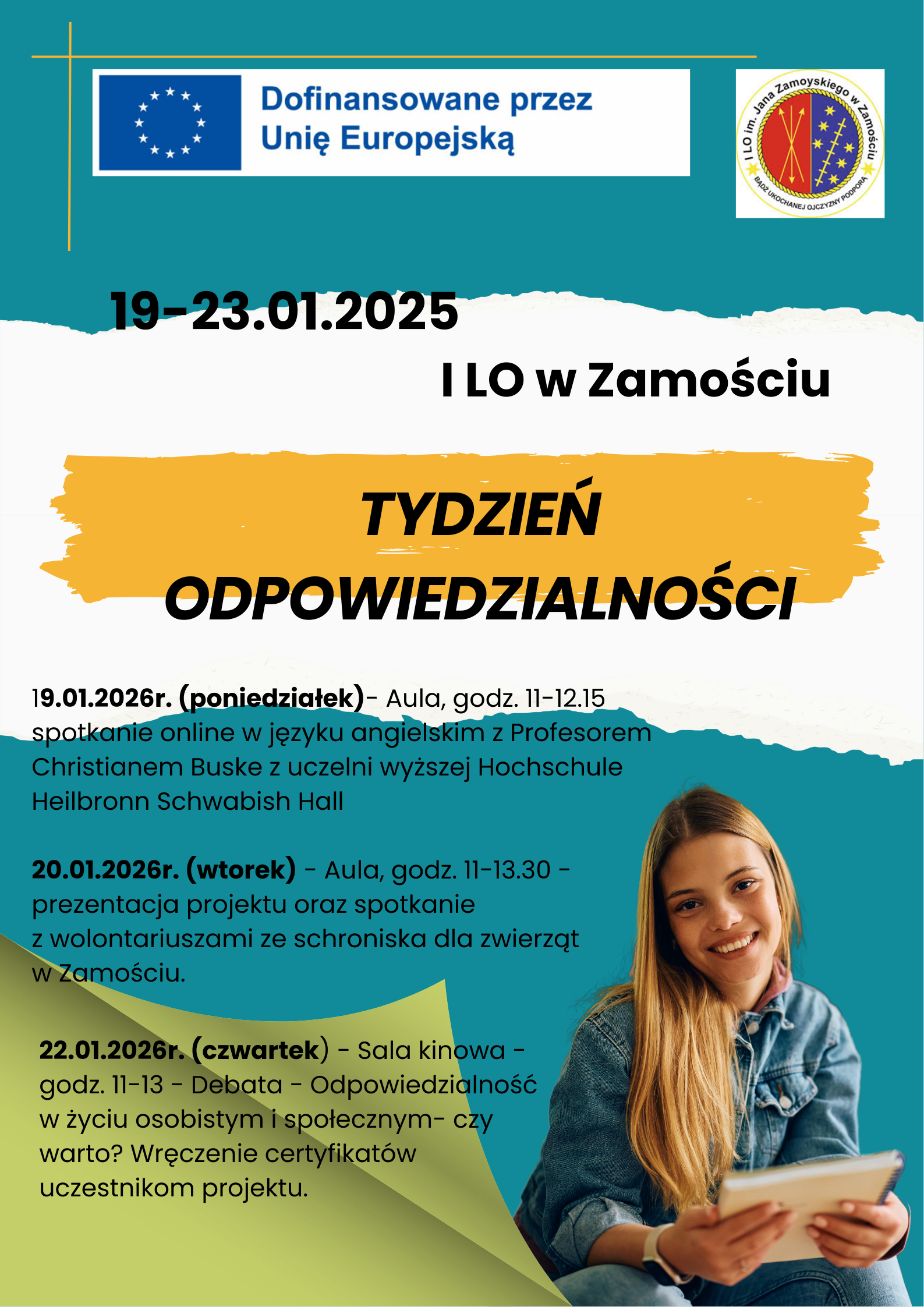 W dniach 19–23 stycznia 2026 r. w I Liceum Ogólnokształcącym im. Jana Zamoyskiego w Zamościu odbędzie się Tydzień Odpowiedzialności – wydarzenie poświęcone refleksji nad odpowiedzialnością w życiu osobistym i społecznym młodych ludzi. Inicjatywa realizowana jest w ramach projektu dofinansowanego ze środków Unii Europejskiej.