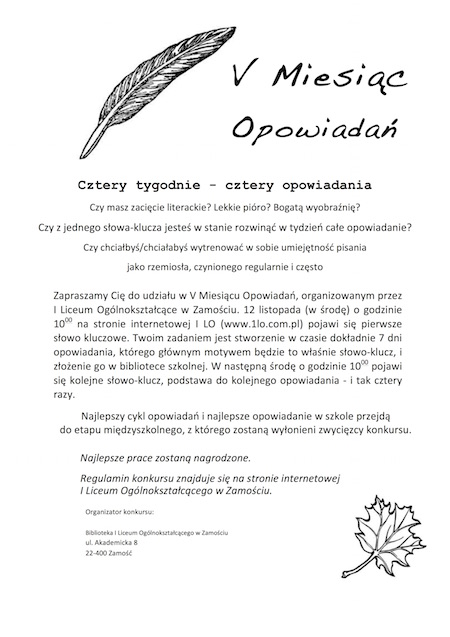 Zapraszamy do udziału w piątej edycji konkursu literackiego. Od 12 listopada na naszej stronie internetowej publikowane będą słowa kluczowe. Konkurs polega na napisaniu czterech opowiadań „na zadany temat” w ciągu 4 tygodni. Szczegóły w zakładce Konkursy.