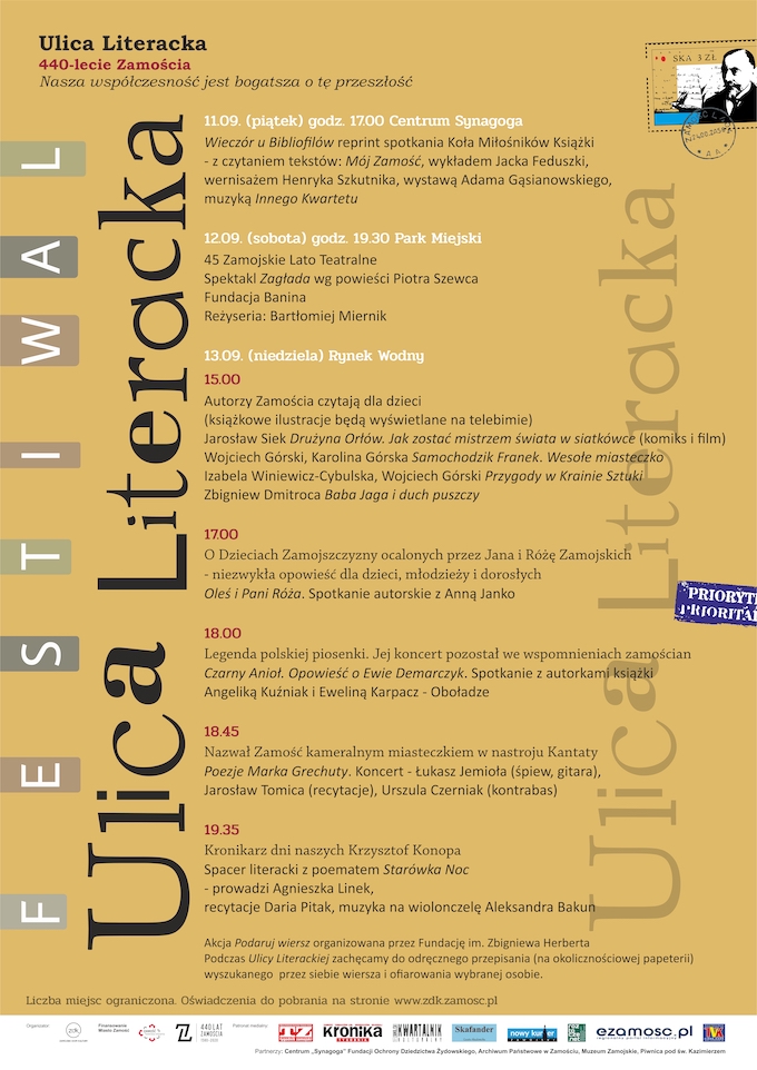 Miłośników literatury zapraszamy na festiwal Ulica Literacka. Już w najbliższe weekend czeka nas mnóstwo wydarzeń związanych z książką i literaturą, a także koncert piosenek Marka Grechuty i niezwykły spacer z poematem Krzysztofa Konopy „Starówka Noc”, który poprowadzi absolwentka naszego Liceum Pani Agnieszka Linek, a oprawę słowno-muzyczną zapewnią wasze koleżanki: Daria Pitak i Aleksandra Bakun.