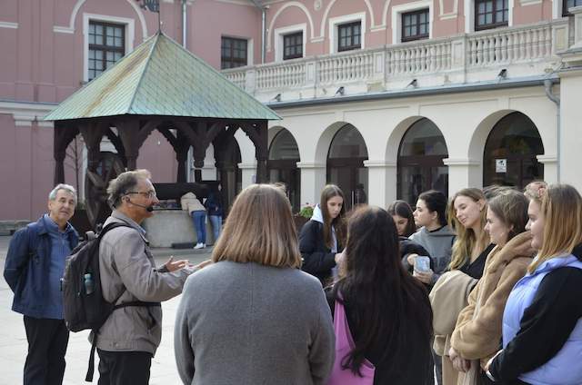 Po wykładzie, całą klasą przemierzyliśmy Stare Miasto wraz z przewodnikiem prezentującym nie tylko wielobarwność oraz piękno Lublina, lecz także jego historyczne korzenie. Po drodze wstąpiliśmy również na KUL w celu obejrzenia wystawy muzealnej na temat Idziego Radziszewskiego, współzałożyciela i pierwszego rektora KUL. Podczas spaceru po starówce z zapałem mogliśmy wysłuchiwać historii o dawnych zabytkach, naznaczonych piętnem czasu. Oczywiście, nie mogłoby być pominięte zwiedzanie Zamku Lubelskiego oraz mieszczącej się wewnątrz Kaplicy Trójcy Świętej. Później wspólnie wspięliśmy się na taras widokowy, mieszczący się w wieży zamkowej, w celu upamiętnienia tego wyjazdu. Całe przedsięwzięcie, zakończyliśmy wspólnym posiłkiem w pobliskiej galerii. Ostatecznie powróciliśmy do Zamościa wraz z nowymi wspomnieniami.