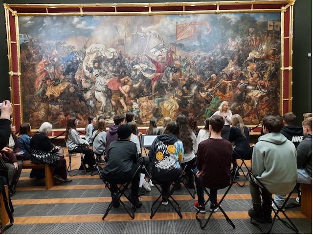 Pierwszym przystankiem w planie wycieczki było Muzeum Narodowe, gdzie, oprócz zwiedzania wystaw stałych, młodzież wzięła udział w lekcji muzealnej nt. sztuki i literatury XIX wieku, która przypomniała im specyfikę i osiągnięcia polskiej kultury epoki romantyzmu oraz wprowadziła w klimat realizmu za pomocą najwybitniejszych dzieł malarstwa polskiego doby pozytywizmu takich, jak, niedawno odzyskana, „Żydówka z pomarańczami” czy „Święto trąbek” A. Gierymskiego. Duże wrażenie zrobiła również ekspozycja obrazów Jana Matejki ze w słynną „Bitwą pod Grunwaldem”.