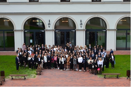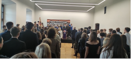 Oficjalna cześć uroczystości miała miejsce w auli - w gmachu pięknie odrestaurowanej Akademii Zamojskiej. Na początku wprowadzono Sztandar Szkoły i odśpiewano hymn państwowy. Głos zabrał Przewodniczący Samorządu Uczniowskiego, Wojciech Wilczyński, który powitał wszystkich zebranych i skierował ciepłe, koleżeńskie słowa do maturzystów i byłego Samorządu Uczniowskiego.