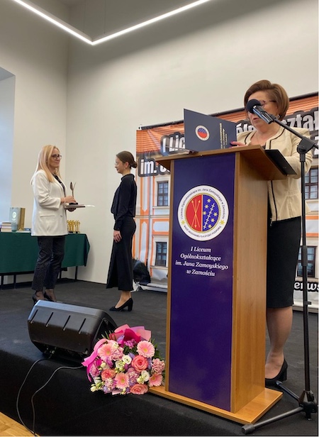 Głos zabrał również Jakub Hałasa, były Przewodniczący Samorządu Uczniowskiego. W pięknym, wzruszającym wystąpieniu podsumował czas czteroletniej nauki w I LO. Zwrócił uwagę, że ten rocznik, który doświadczył nauki w Pałacu Zamoyskich, jako pierwszy kończy naukę w odnowionym po latach budynku Akademii Zamojskiej. Kuba, dziękując wszystkim w imieniu absolwentów i rodziców, złożył kwiaty na ręce Pani Dyrektor.