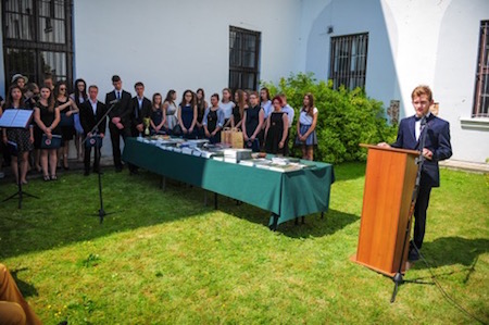 Zakończenie roku szkolnego rozpoczęła Msza Św. w Kościele Św. Katarzyny, dalsza część uroczystości odbywała się na dziedzińcu szkolnym, gdzie zebranych powitał przewodniczący Samorządu Uczniowskiego Mariusz Leśniak.