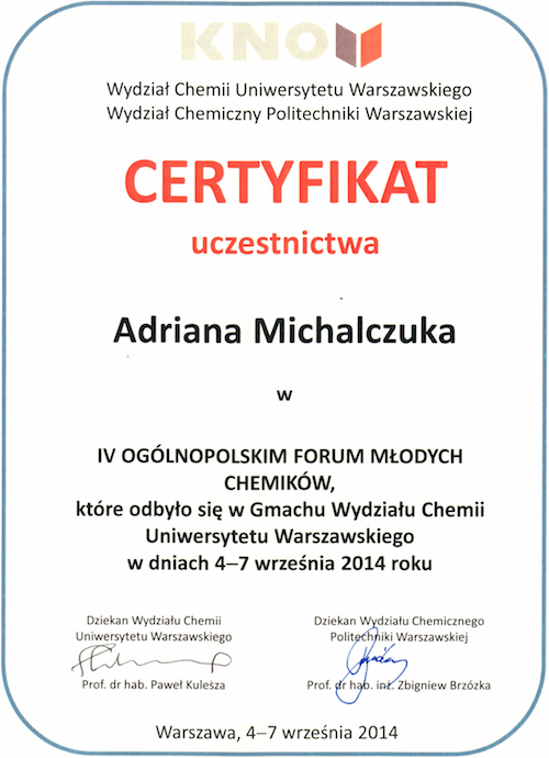 Kontynuując ideę zapoczątkowaną w 2011 roku przez Wydział Chemii Uniwersytetu Jagiellońskiego, Polskie Towarzystwo Chemiczne oraz Wydział Chemii Uniwersytetu Warszawskiego zorganizował w dniach 4-7 września 2014 roku IV Ogólnopolskie Forum Młodych Chemików. Forum skierowane było do zainteresowanych chemią uczniów szkół ponadgimnazjalnych, którzy zaprezentowali swoje prace w postaci wystąpień (komunikatów, posterów) oraz uczestniczyli w wykładach, warsztatach, pokazach i innych imprezach towarzyszących. W forum udział brało dziesięcioro uczniów z naszego województwa, a  naszą szkołę reprezentowali Aneta Komisarczuk z klasy 3B i Adrian Michalczuk z klasy 2A.