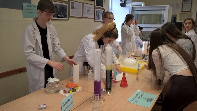 Nie były to jednak zwykłe wykłady! Z każdą partią materiału związane były liczne doświadczenia, które ułatwiły zrozumienie trudnych pojęć czy zapamiętanie charakterystycznych reakcji, co istotne, każdy uczeń miał możliwość wykonania ich samodzielnie pod okiem p. T. Deptuły doktoranta Wydziału Chemii Uniwersytetu Warszawskiego oraz  wolontariuszy (studentów i uczniów) – współpracujących z Fundacją „Przyszłość w nauce”.
