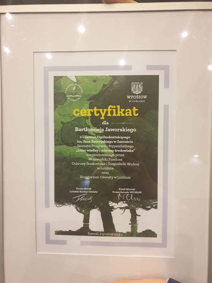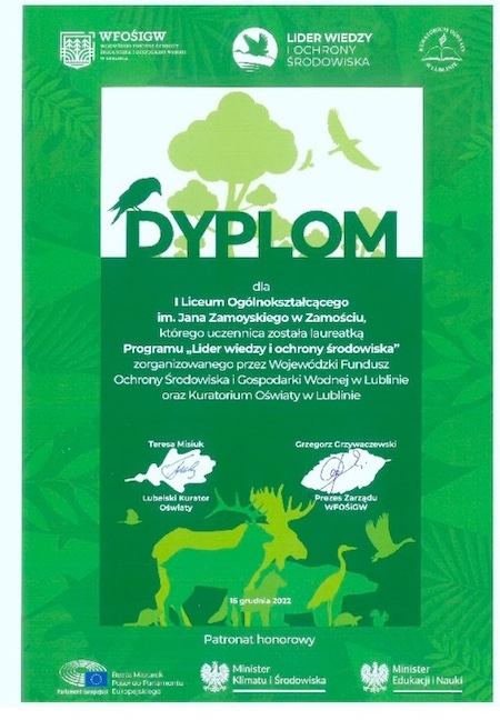 Gabrysia Byra /3G/ otrzymała tytuł laureatki oraz stypendium w ramach programu „Lider Wiedzy i Ochrony Środowiska” realizowanego przez WFOŚiGW w Lublinie we współpracy z Kuratorium Oświaty. Honorowy patronat nad programem objęli Poseł do Parlamentu Europejskiego Beata Mazurek, Minister Klimatu i Środowiska Anna Moskwa oraz Minister Edukacji i Nauki Przemysław Czarnek. Uroczysta gala podsumowująca tegoroczną edycję programu odbyła się 16 grudnia 2022 r. w Tomaszowie Lubelskim.